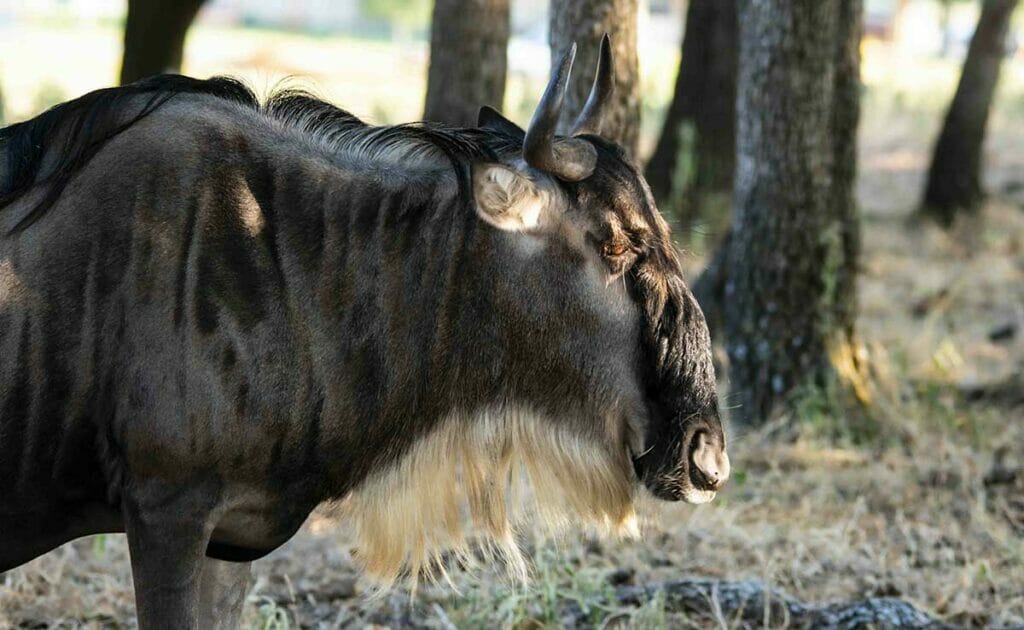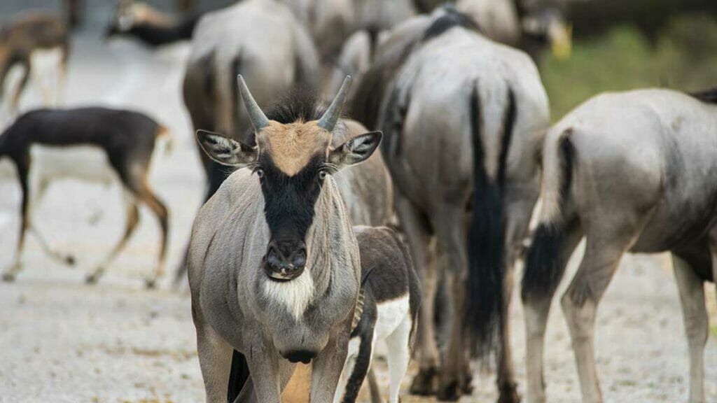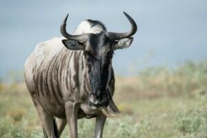 The common wildebeest, also referred to as the blue wildebeest, is a member of the antelope family. However, its heavy build and disproportionately large forequarters make it look more like a relative of a cow. Wildebeest have large heads with high eyes and a rounded bridge. A mane of long, dark hair runs along their neck and shoulders, contrasting with the rest of their silvery-gray hair. In the right light, this short, striped hair can even appear blue, hence their name.