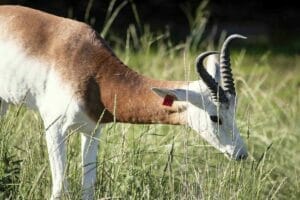 Characteristics | Antelope with bright white coat and reddish brown neck; S-shaped horns |