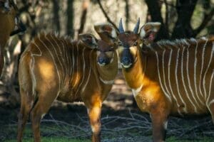 The Eastern mountain bongo is a striking coppery-red antelope with thin white stripes. These stripes vary in number between individuals, but there are usually between 10 and 15 stripes per side. Female bongo are typically brighter in color than the males, who tend to have a smokier appearance. Both sexes have spiraled, lyre-shaped horns, though the males are large and thicker. They are the heaviest and most colorful African forest antelope.