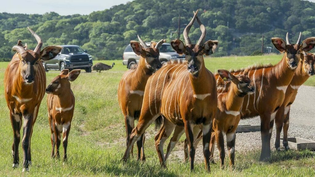 Unless you visit early or late in the day, the bongo will most likely be on the far side of the second pasture you enter, in the wooded area.