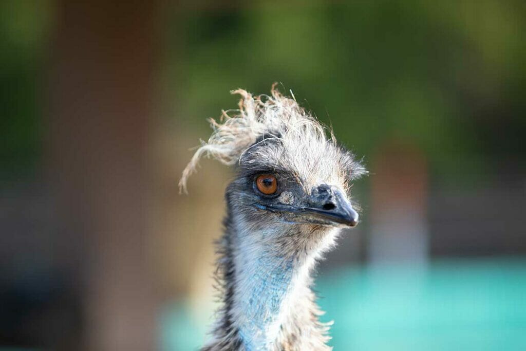 The emu is the world’s second-tallest flightless bird, second only to the ostrich. Its wings are tiny at less than eight inches long, giving emus the appearance of having no wings at all. The feathers on an emu have a characteristic shaggy look thanks to their two shafts, with barbs so widely spaced that they do not interlock. These feathers are a grayish-brown to black color, and cover the whole body except for the legs and neck, which are bare-skinned. The skin of an emu has a bluish tint, contrasting with their striking amber eyes.