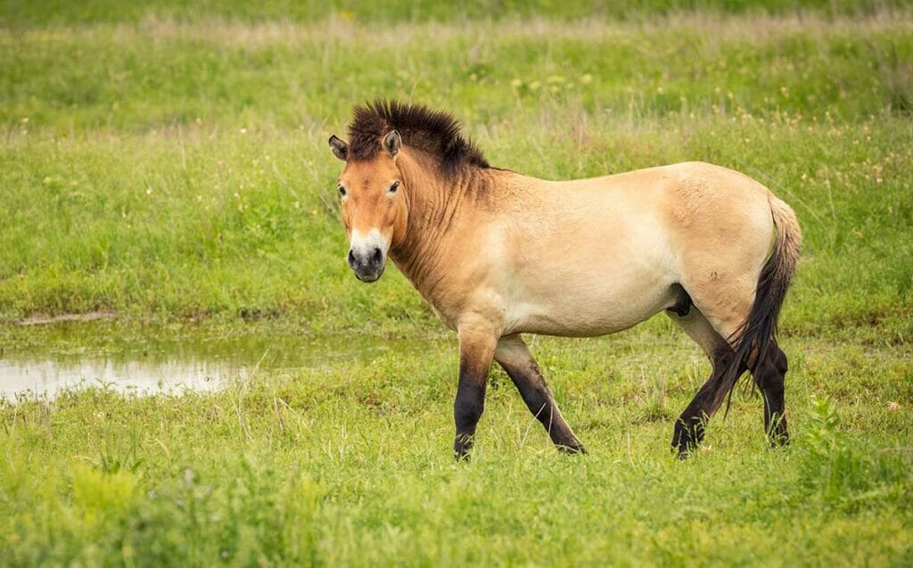 The Przewalski’s ( pronounced shuh-VOLL-skis) horse is often called "the last true wild horse" and is the only ancestor of the domestic horse alive today. However, they themselves are descended from a truly ancient horse species called Botai horses, found in Northern Kazakhstan 5,500 years ago. With a short, muscular body, Przewalski’s horses are smaller than most domesticated horses. Their hair is a muddy brown color that is typically lighter the closer it gets to their underbelly. Their legs and nose are a darker brown that mirrors the color of their tail and short, erect mane.