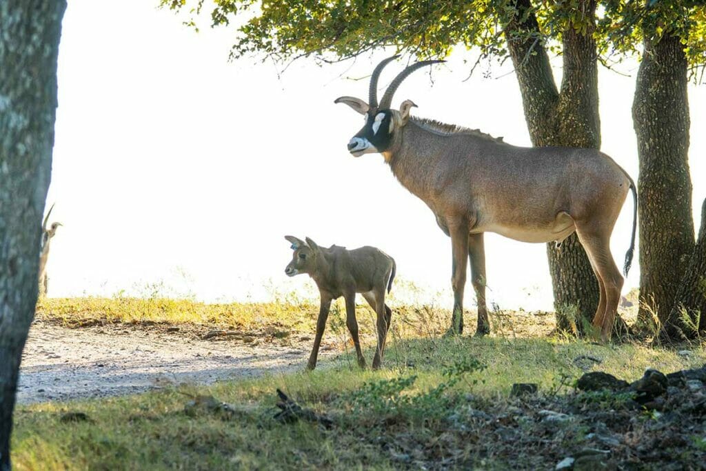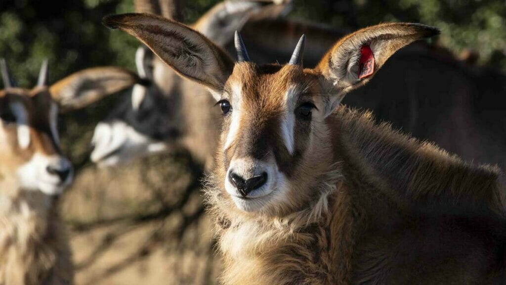 Roan are the fourth largest antelope species in the world, with adults able to reach as much as 500 pounds. Both male and female roan have dusty brown hair, backwards-facing horns and black “face masks.” The masks of male antelope are typically much darker and wider than females’. The ears on this species are large starting from birth, often giving adolescents an oversized look. Finally, they have large, powerful bodies and slender legs that are perfect for running.