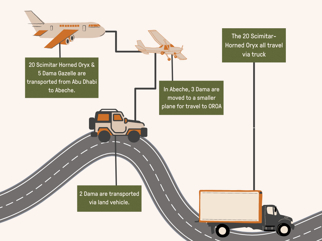 Several years ago, Fossil Rim got our first opportunity to work with Sahara Conservation and Environment Agency—Abu Dhabi. Thanks to our specialization in a variety of endangered desert animals, the organizations have invited staff members like Adam Eyres, our Director of Animal Care, and Dr. Julie Swenson, our Associate Veterinarian, to lend our knowledge. This partnership began with scimitar horned oryx, before involving addax, dama gazelle and even ostrich. Our team members have been able to participate in several captures, and several release programs over the years, including one this past March. In this case, the program involved transporting wildlife being held in the United Arab Emirates, and managed by the Environment Agency–Abu Dhabi, to a pre-release location in Chad. It also meant over 30 hours in a plane, traversing bumpy roads and coordinating with groups across international borders- all while transporting fragile cargo. So, what did this incredible trip look like for our team members?