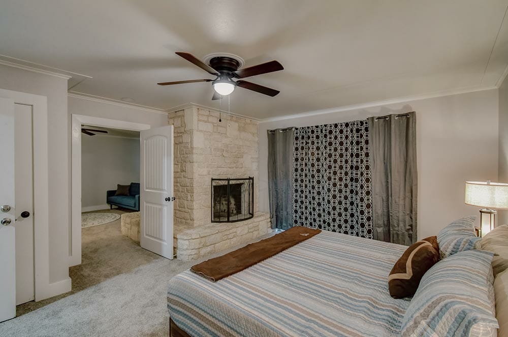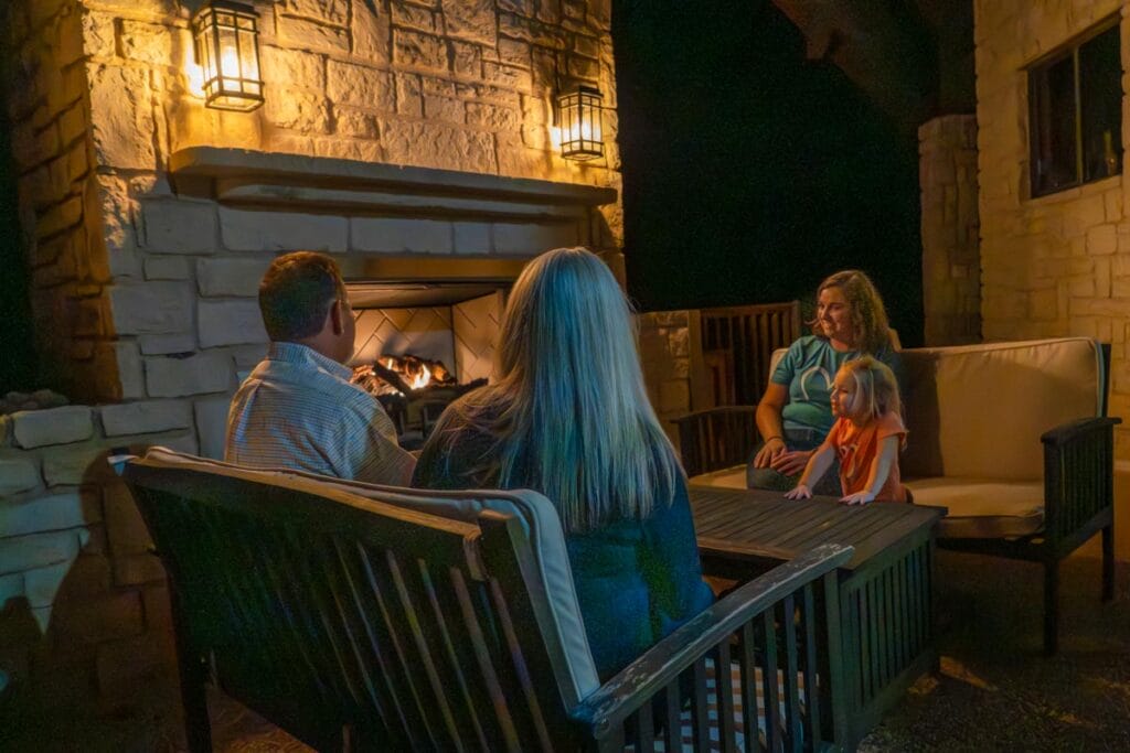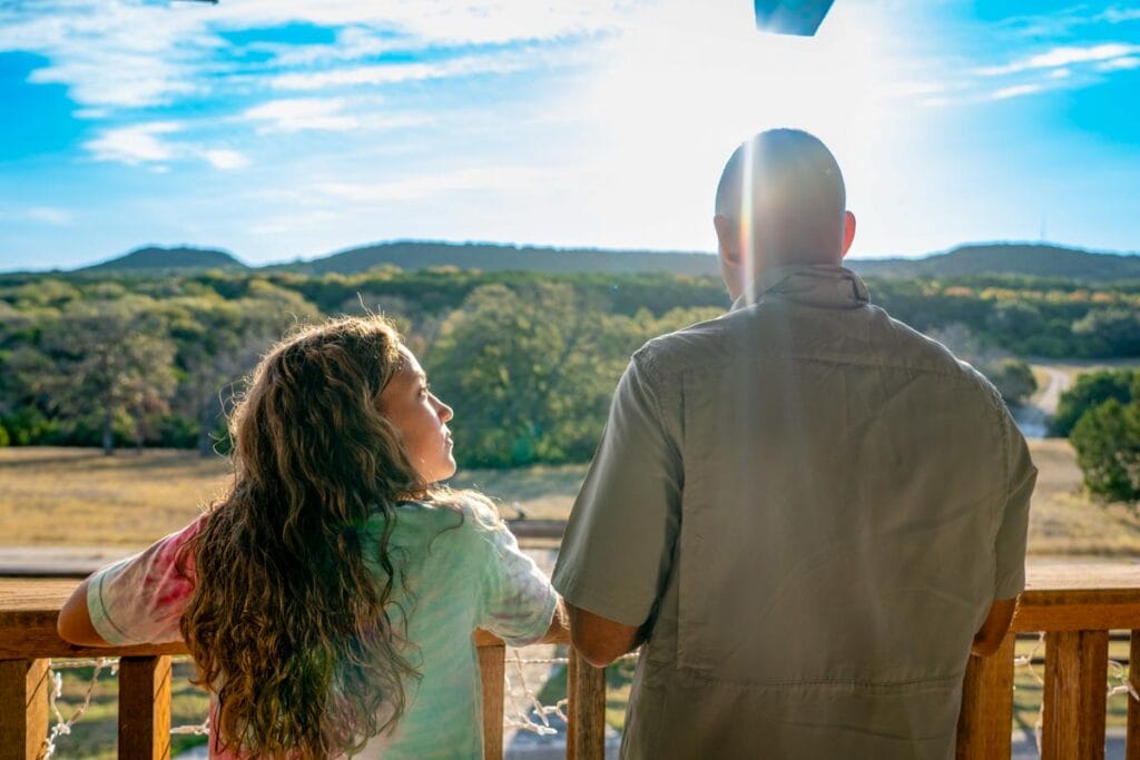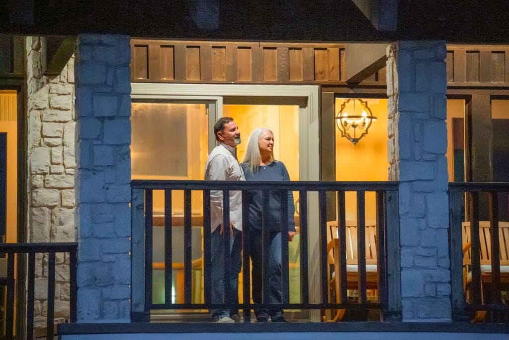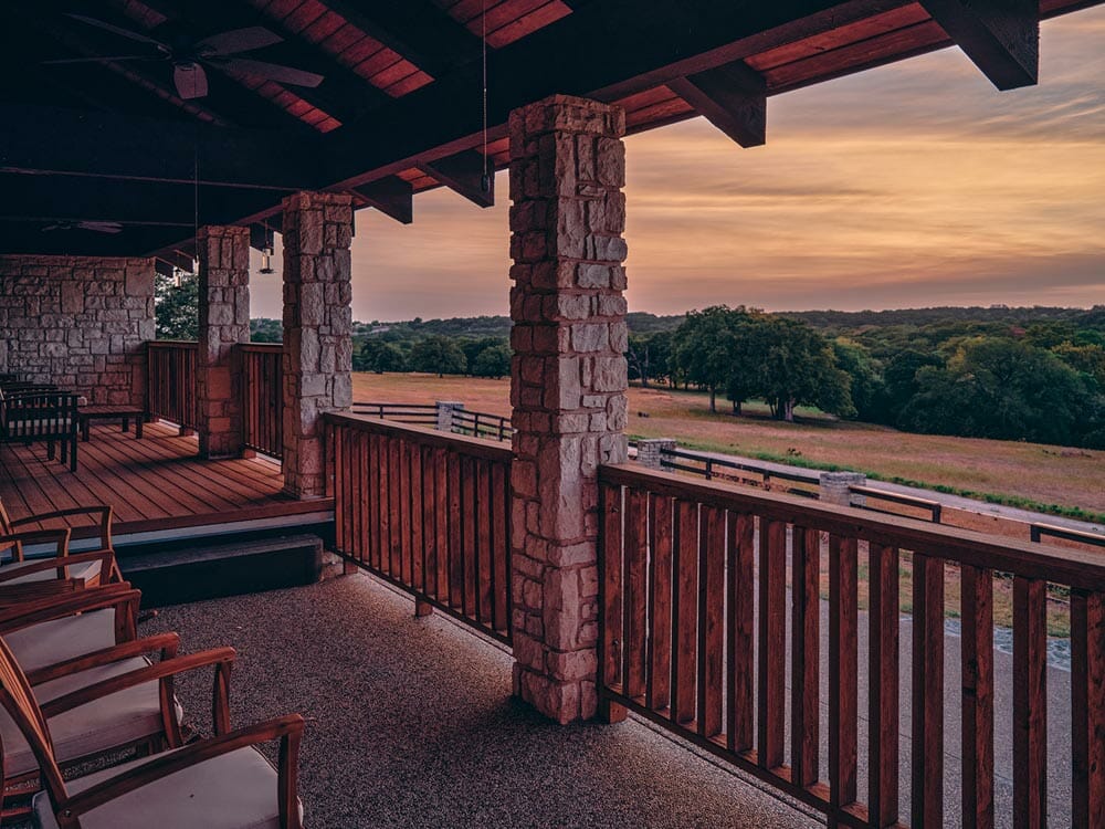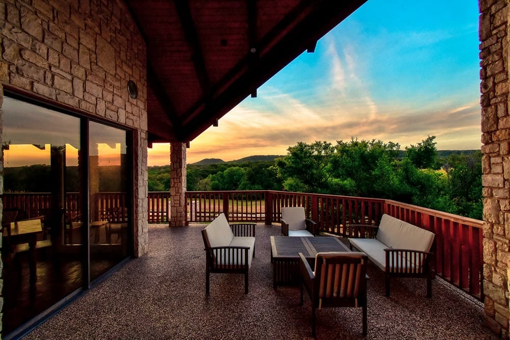 The renovated balcony wraps around the majority of the second floor. Step through the sliding doors of the Great Room and rest easy on any of the seating options. Fans keep the air circulating even in our Texas summers, and in winter enjoy the warmth of our beautiful outdoor fireplace. With enough patience you may even spot some of our wildlife wandering the pastures beyond. Patio seating can be taken advantage of anytime, though it’s especially comfortable at sunrise.