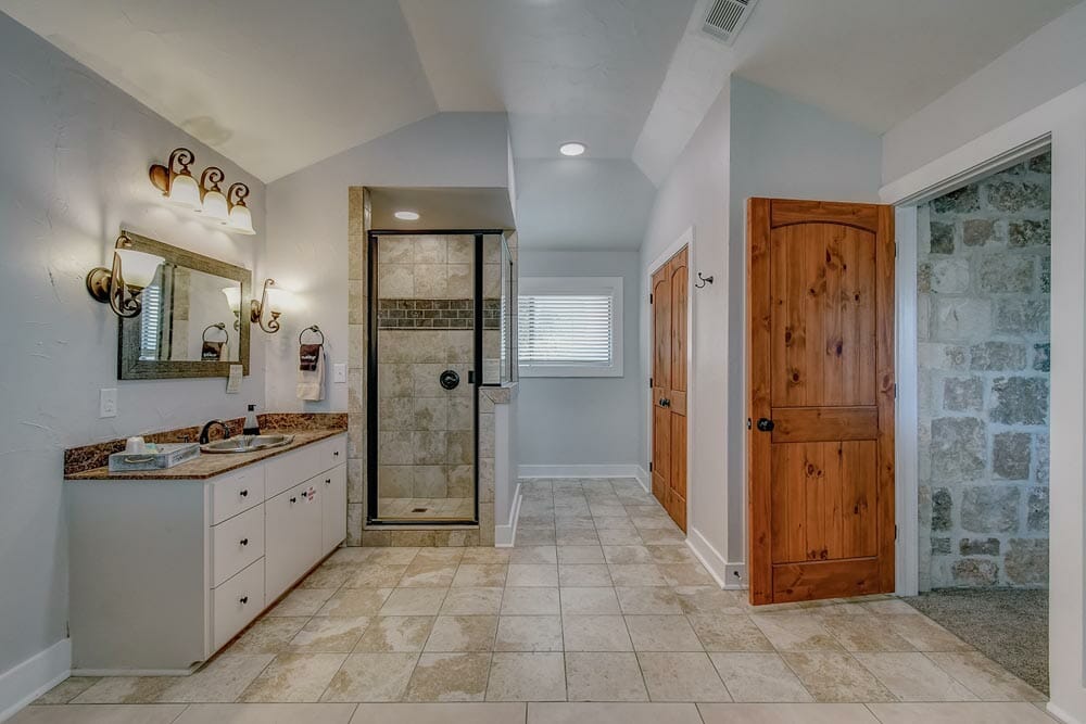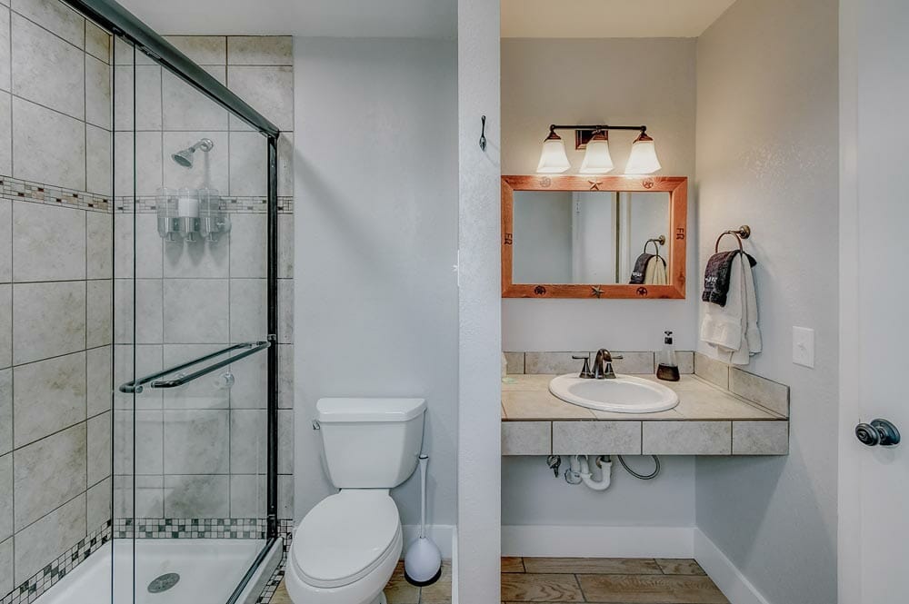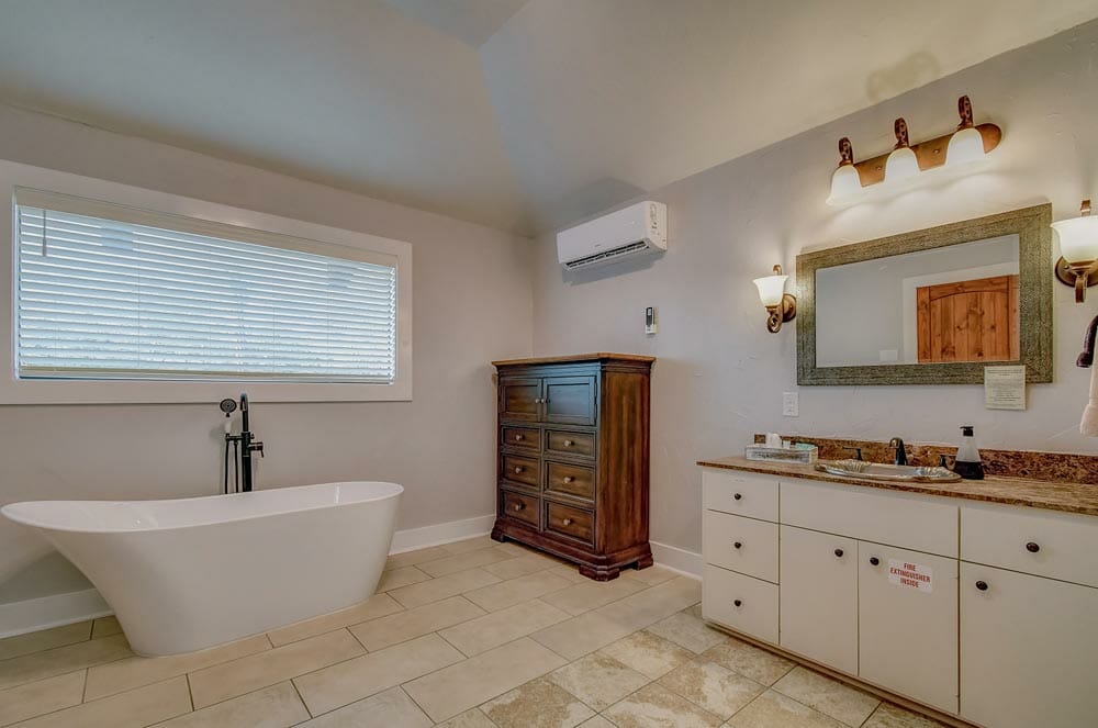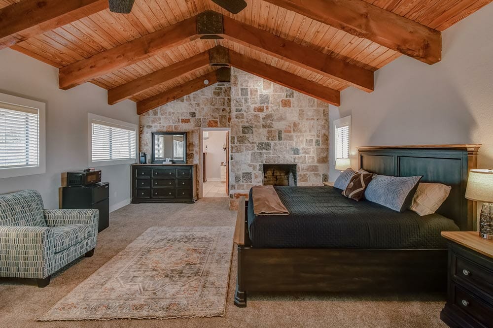 The Bluebonnet Suite takes up the third floor of the Lodge. The suite is a cozy blend of dark woods and stone. Settle in next to the decorative fireplace and relax. Featuring a king-sized bed, futon, and optional twin roll away bed, this room can accommodate the whole family. The newly renovated bathroom includes a standalone soaking tub and walk-in shower, as well as a large closet.