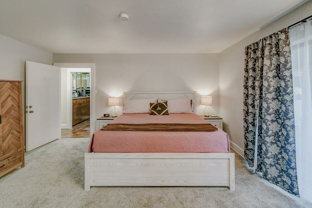 One of the two guest rooms located on the second floor. Perfect for a relaxing and intimate stay, this room features a king-sized bed and futon. Guests in this room also have access to a private bathroom as well as a private patio. Private parking is available for your convenience.