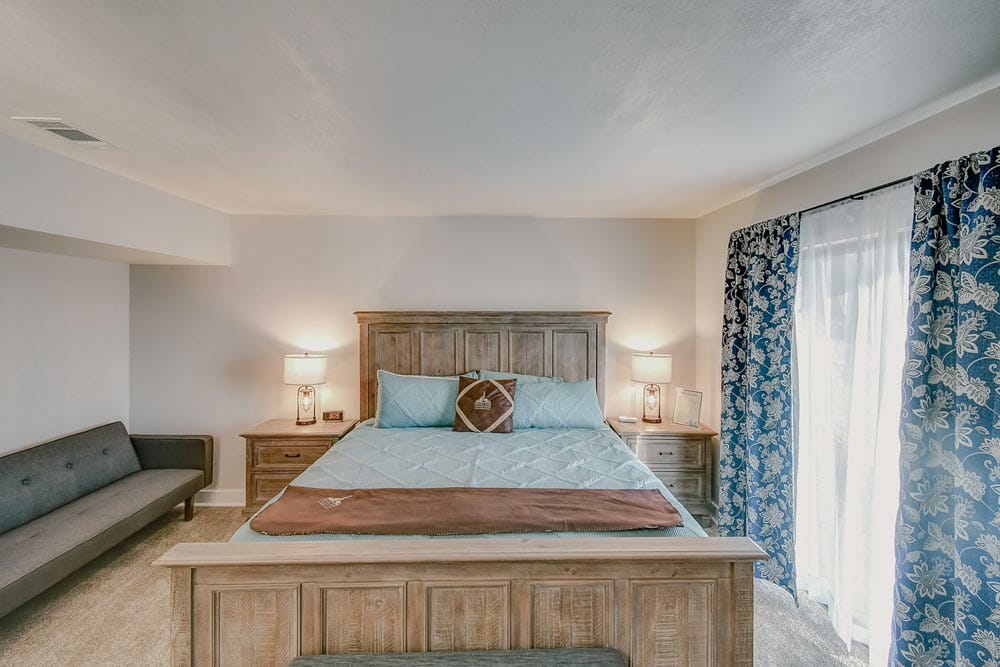 Located on the first floor across from the Lounge, this king suite is made up of two adjoining rooms. The main bedroom features a king bed, while the second room has one full-size sofa bed and one futon. Large enough for the whole family, this suite is also perfect for a smaller group that wants a private living area. A bathroom is attached, as well as access to a large patio. Maximum occupancy is six.