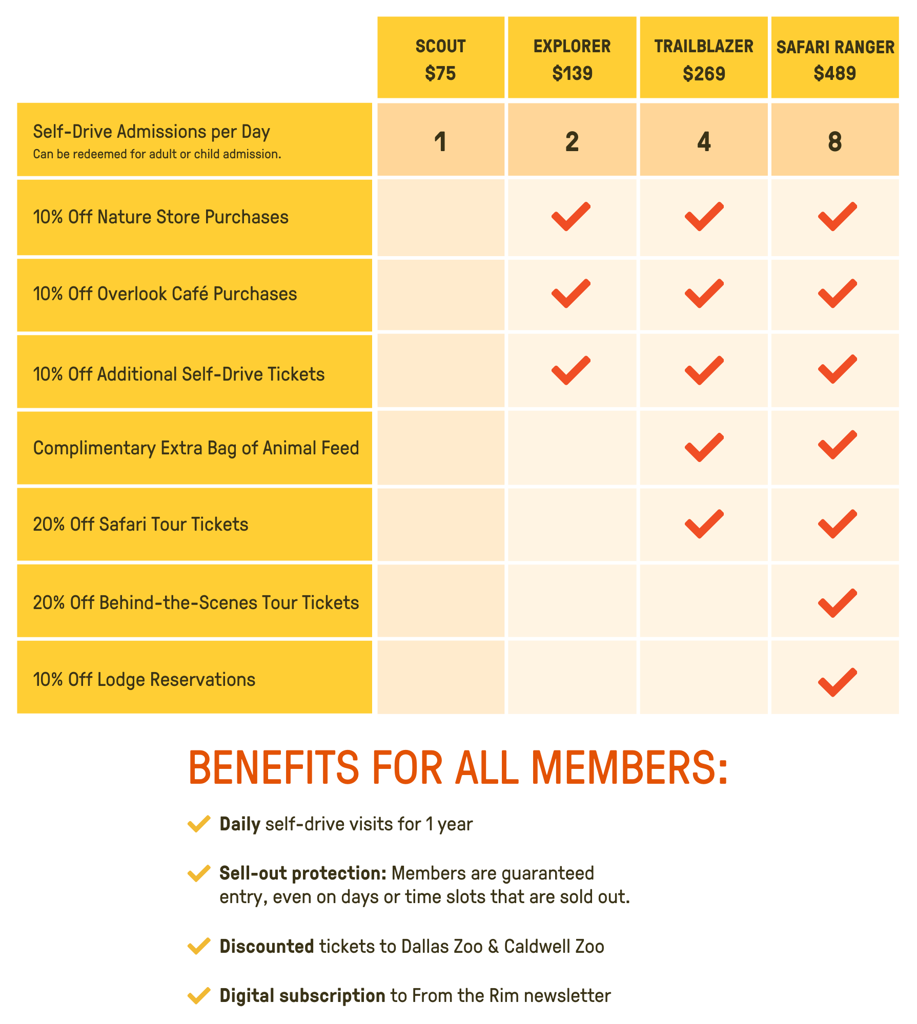 - Safari Ranger is our highest-level membership, providing self-drive admission for up to eight guests and expanded discounts on tours, lodging, and on-site shopping.