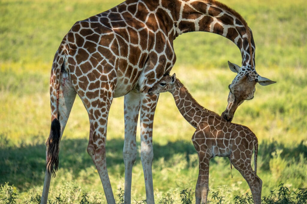 As a herd species, giraffes learn a lot from each other, and Fossil Rim’s are no exception. Janson has only recently started approaching vehicles for snacks. Each giraffe here has their own personality: some eagerly visit cars for feed, while others prefer to keep their distance.  Janson’s mother is known for enjoying her personal space, and observing guests from a distance. Time will tell if this calf will take after his mom, or his food-motivated dad, Manansi.